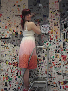 Tänään on tullut vietettyä todella ihana päivä! Ensinnäkin kesä on rantautunut! :) Vetäsin tänään mekon päälle ja hyppäsin pyörän selkään. Kaupungin suunnalle kun pyöräilin en voinut kun hymyillä, niin hyvät fiilikset tuli auringosta, lämmöstä ja pienestä tuulenvireestä sekä siitä että olin menossa treffaamaan ystävää joka tuli viettämään Suomeen kesäänsä <3 Sainpa siinä sitten vastaantulijoillekin hymyä huuleen, hymyileviä tervehdyksiä vastaantuleville siis olen tarjonnut :D Henna L-H:n kanssa sitten treffattiin ja istahdettiin terassille nauttimaan auringosta ja vaihtamaan kuulumisia lasillisten karpalon makuisten virvokkeiden kera ;) Piipahdettiin sitten Street art näyttelyssä Satakunnan taidemuseossa ja päästiin itsekin taiteilemaan. Varsinaisen näyttelyn taideteoksista en voi tänne laittaa kuvia mutta omista tekeleistämme kyllä :) Näyttelyssä sai itsekin siis tehdä taidetta yhdelle seinälle :) Näyttelystä suunnattiin kirjurinluodon kautta kummatkin kohtia omia kotejamme kun nälkä jo kurni. Itse en ehtinyt kauaa kotona olemaan, kun suunnattiin Rikun kanssa kaupunkiin, mun oli pakko saada Suomen kesän eka ulkojäätelö :D Tästä päivästä on siis nautittu ihan täysillä! <3